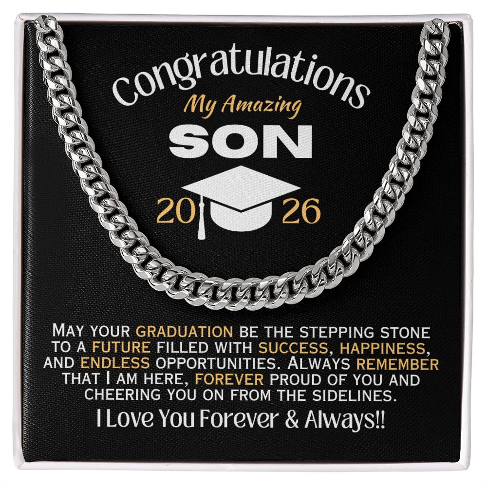 Give your son a classic necklace that shows off their strength and style! This "My Amazing Son - 2026 Graduation - Necklace" is the perfect gift for his graduation. Available in polished stainless steel or 14K yellow gold, you can be sure this wonderfully weighted necklace will be a staple piece in their wardrobe. And since the chain is adjustable, this necklace will look spectacular on everyone who wears it.